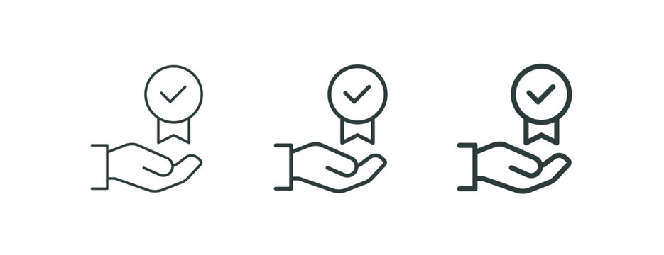 Quality guarantee, certification trust, approval minimal outline icon. Line sign hand holding award badge with check mark. Vector isolated pictograms for web app on white background editable stroke.