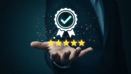 Quality assurance and digital certification concept. Business hand selecting five-star badge icon on virtual screen. Symbol of trust, verified service, high standard approval, and digital excellence.