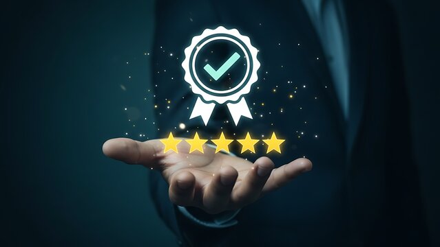 Hand presenting glowing certification badge with checkmark and five-star rating in a dark business setting