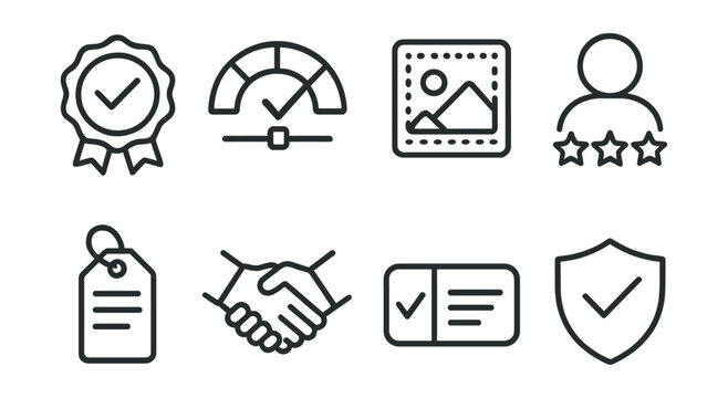 Line style icons of trust indicators: verified source badge, transparency trust meter, content origin stamp, user rating icon, source disclosure tag, trusted partner symbol, reviewed tag, platform