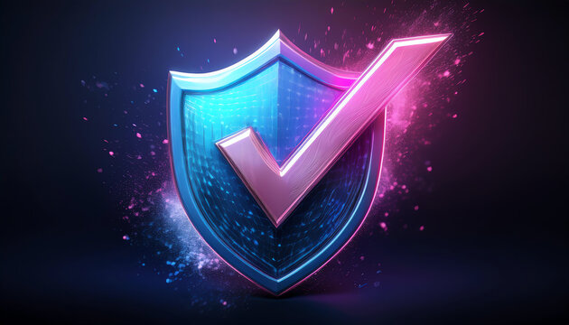 A vibrant, digital shield symbol with a checkmark, representing security and reliability in a modern design.