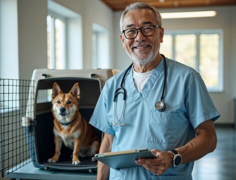 Smiling veterinarian with dog at clinic displaying trusted pet care
