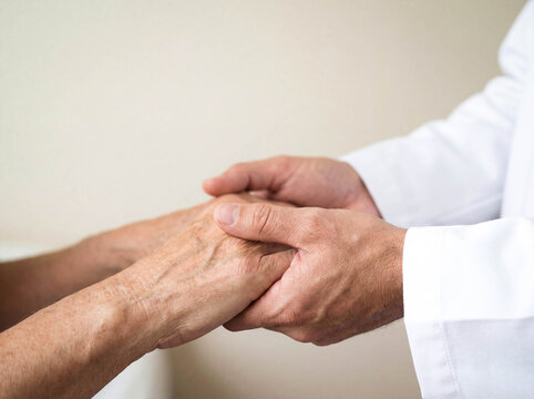 Doctor holding patient hands support empathy medical care trust compassion closeup healthcare hospital mental health comfort reassurance professional help gesture clinic