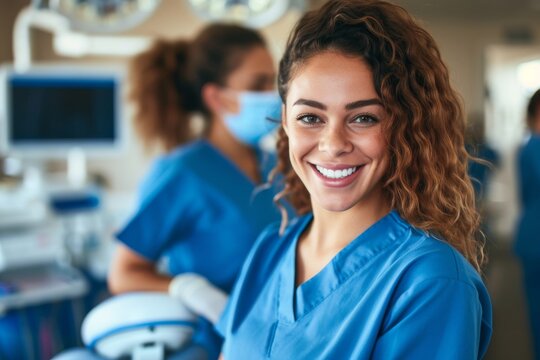 Smiling healthcare professionals in blue scrubs with surgical masks