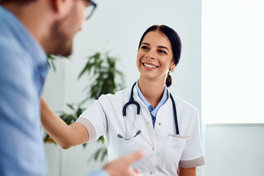 Smiling young female doctor in medical office. Woman wearing white coat, stethoscope. Healthcare pro at work. Medical, hospital, doctor, medicine, health care. Professionalism, trust, health
