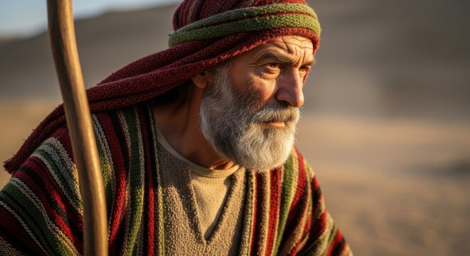 Old man with a staff wearing traditional desert attire, biblical times concept. Eastern prophet or apostle looking into distance.