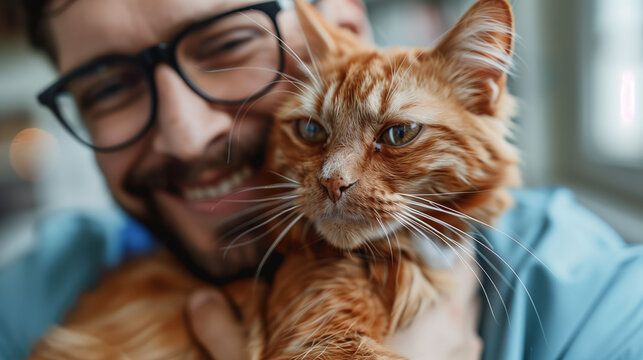 Confident Male Veterinarian with a Stethoscope Holding a Tabby Cat: Professional Pet Care and Veterinary Services, Clinic Hospital
