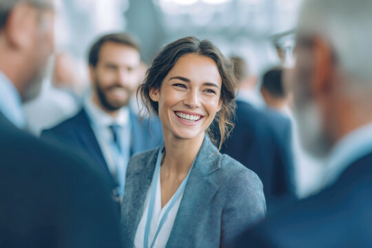 A business event exhibition shows businesspeople discussing with confident trusting expressions in a friendly setting.