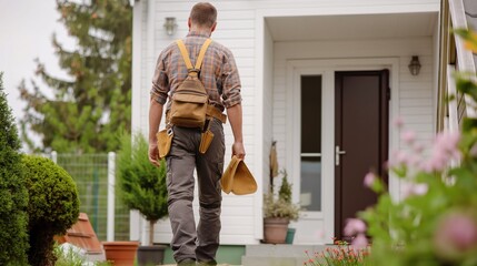 Hardworking Craftsman: A skilled craftsman in workwear, carrying tools and a toolbox, walks towards a suburban home, ready to tackle a new project.