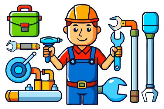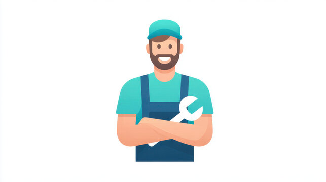 Smiling repairman holding wrench, wearing cap and overalls, standing with arms crossed, representing friendly and professional service for maintenance or repair work