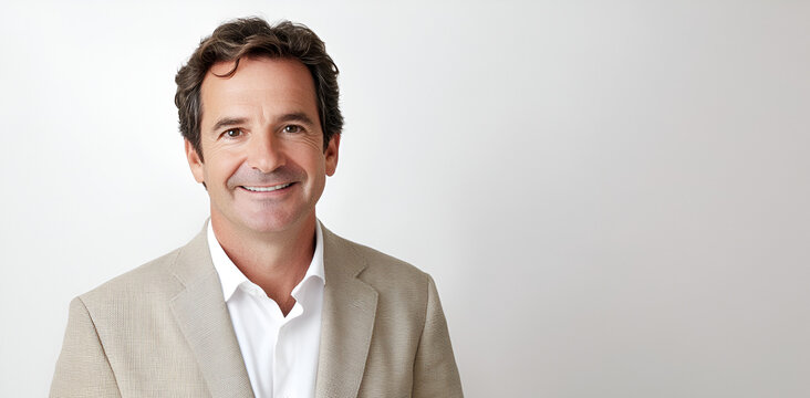 Confident Professional Portrait: A friendly, middle-aged man with a warm smile, wearing a light beige blazer and crisp white shirt, looks directly at the camera in a professional headshot.