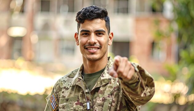 A confident military personnel directs attention towards the viewer with a warm smile and pointing finger.