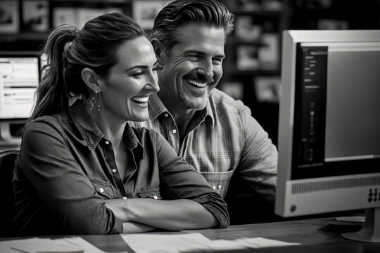 Young man and woman in modern office working as a team. Generative Ai