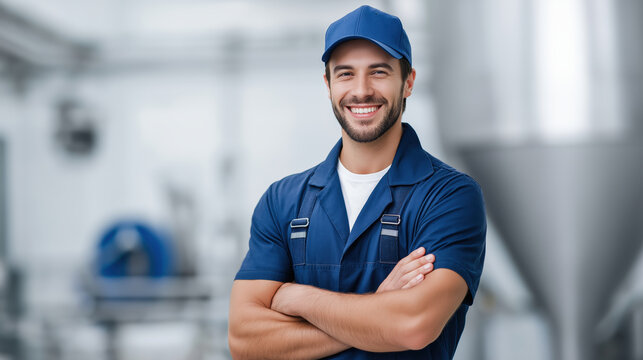 Smiling Technician: A friendly, cheerful technician poses confidently, arms crossed, sporting a blue cap and jumpsuit, ready for action. Capturing professionalism and approachability.