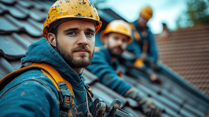 Focused roofer in safety gear, two colleagues blurred in background, working on sloped tile roof