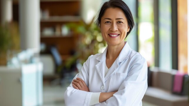 East Asian Female Doctor in White Coat Smiling, Professional in Modern Medical Office, Healthcare Concept