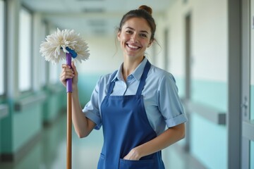Confident Female Janitor in a Hospital Setting Shows Professionalism and Efficiency with a Smile