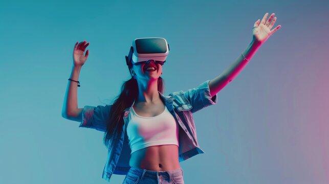 Smiling Caucasian woman in formal wear trying out virtual reality technology while sitting in the chair in tech store.