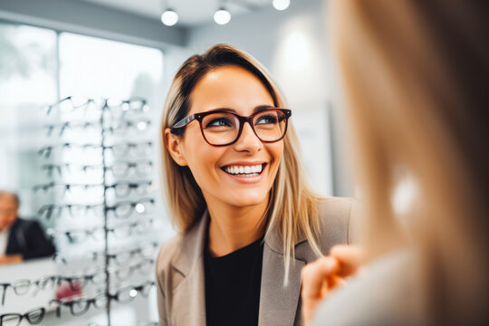 Young woman trying fashionable glasses in optometrist store