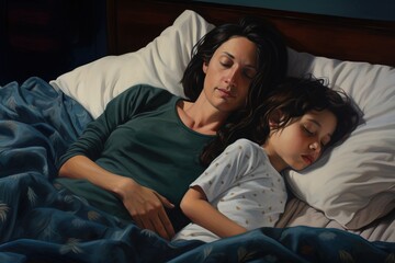 A child in pajamas and a parent in the bed, tucked into bed, warm and cosy, family support, parenthood, taking care of child at home