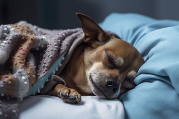 Chihuahua dog resting comfortably in bed, tucked under a warm, textured blanket