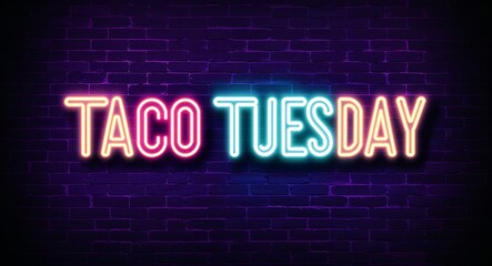 taco Tuesday word lettering glowing with neon light on dark brick wall background