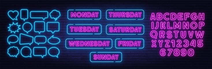 Sunday, monday, tuesday, thursday, wednesday, friday, saturday neon sign on brick wall background.