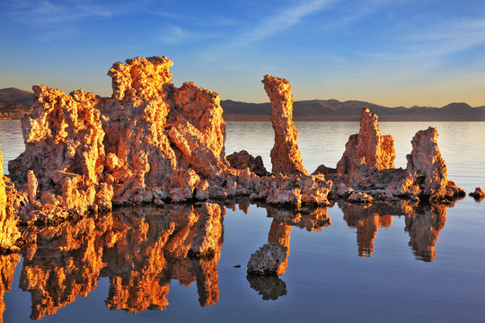 Lake Mono, California, USA (A saline lake with unique tufa formations) in the afternoon where the tufa towers have come to life, their twisted shapes dancing across the lake's surface.