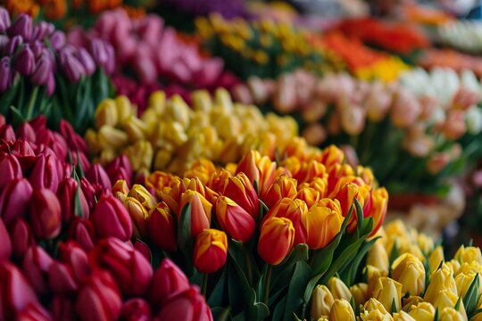 Colorful bouquets of tulips on the stand in the flower shop. Showcase. Floral shop and delivery concept. Flowers market on the street. Many tulips flowers growing in pots for sale in florist's shop.