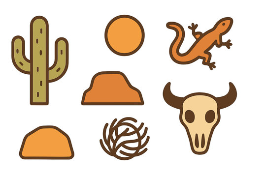 Collection of desert nature symbols including cactus, lizard, bull skull, and tumbleweed