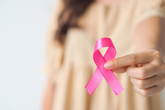 Breast Cancer pink ribbon awareness on woman hand, bow color concept raising awareness campaign on female patient with breast tumor illness (bow isolated with clipping path)