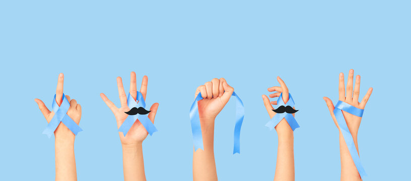 Men's health and Prostate cancer awareness campaign in November. Group of men hands holding blue ribbon awareness  with mustache to support and fight for health.  Movember campaign banner.