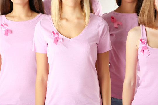 Diverse women joining hands showing pink ribbons for breast cancer awareness