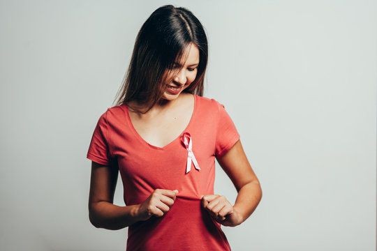 Woman with pink ribbon on light grey background, closeup. Breast cancer awareness