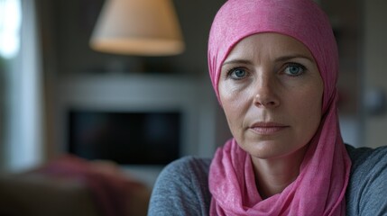 A older woman with cancer, wearing a pink scarf, looks directly into the camera Breast Cancer support