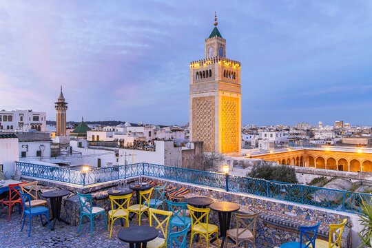 Medina, Tunis, Tunisia. Rooftop cafe overlooking the Great Mosque in the Medina of Tunis.