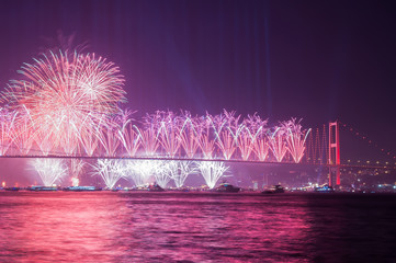 Fireworks over Istanbul Bosphorus during Turkish Republic Day celebrations. 15th July Martyrs Bridge (15 Temmuz Sehitler Koprusu). Istanbul, Turkey..