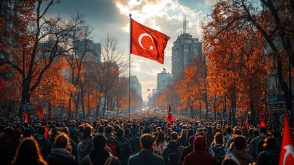 Crowd of people walk through the streets of a Turkish city with the national flag. Generative AI