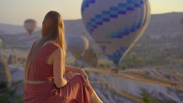 Tourist woman looking at hot air balloons in Cappadocia, Turkey. Happy Travel in Turkey concept. Woman on a mountain top enjoying wonderful view.