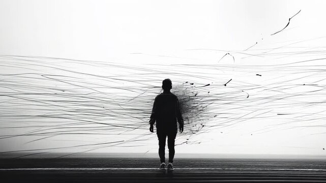 Solitary figure stands amid swirling chaos. Animated lines and particles surround the silhouette, visualizing inner turmoil and complex thoughts in stark black and white contrast.