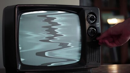 Old vintage TV turning on and turning off animation. 70s, 80s style television. White noise effect on the screen. Analog Static Noise texture. Monochrome, black and white offset flicker. Screen damage