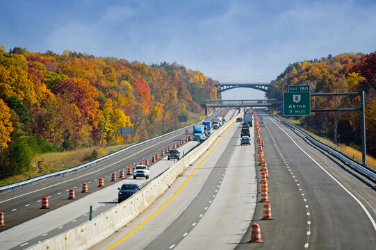Cars, trucks, traffic drive on highway turnpike through colorful autumn leaves. Mountains and rolling hillsides in colorful fall foliage. Transportation, travel, logistics theme.