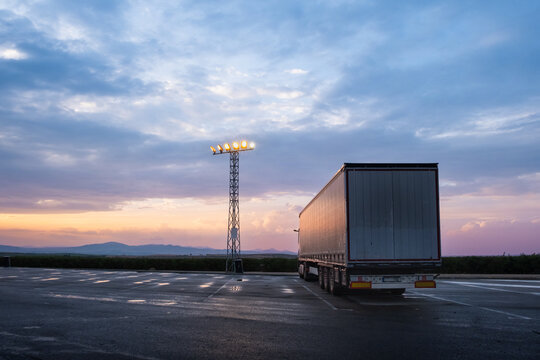 Panoramic view of A huge white trailer is parked in the truck parking lot of a service station. He is watching the sunset with a cloudy sky and the ground wet from the rain. There is a light turret on