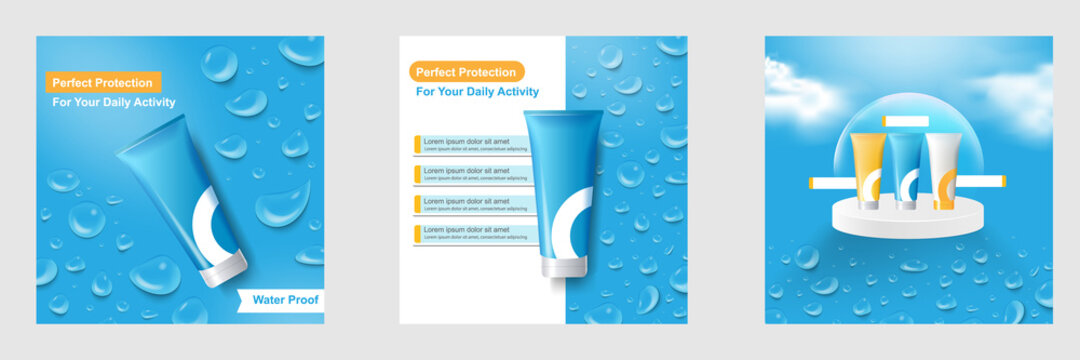 Minimal beauty cosmetic social media square post banner in blue color. For product knowledge, display, price, catalog tips template with cloud sky water droplet dome shield sphere