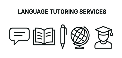 Language tutoring services - speech bubble, book, pen, globe, graduate icon illustration