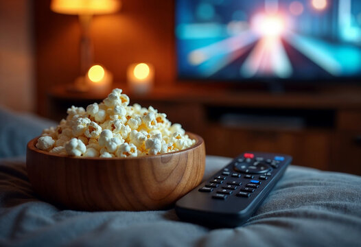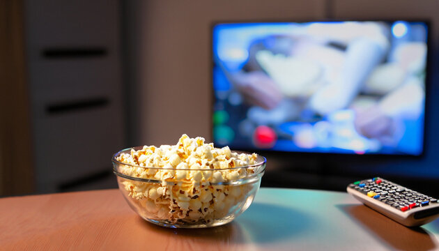 A glass bowl of popcorn and remote control in the background the TV works. Evening cozy watching a movie or TV series at home
