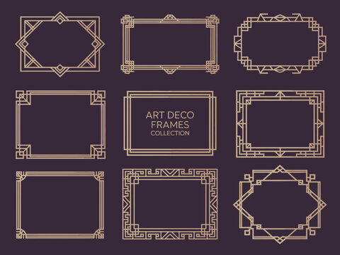 Golden Art Deco Borders Set,  Elegant 1920s geometric frames and vintage ornaments featuring luxury linear patterns, abstract decorative lines, and nouveau style design elements for invitations or bra