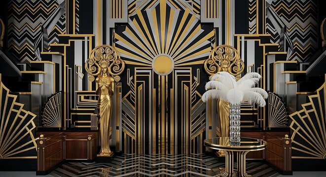 Opulent Art Deco Stage with Gold, Black Patterns, and Feathers.