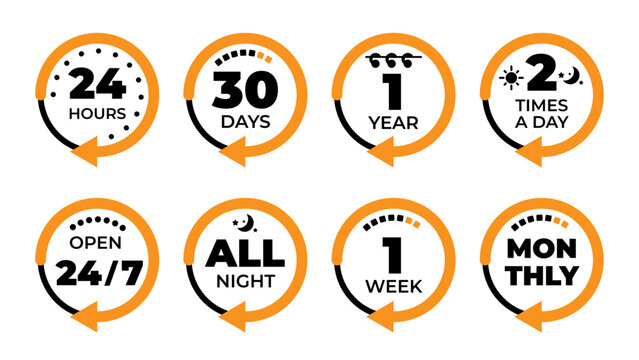 Icons that visually represent various timeframes and special promotional events and time cycles. Orange black vector round time icons. Open 24 hours, month, year, week calendar