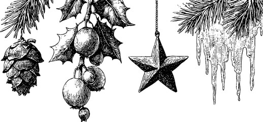 Hand drawn vector winter floral elements. Winter branches and leaves. Hand drawn floral elements. Vintage botanical illustrations.